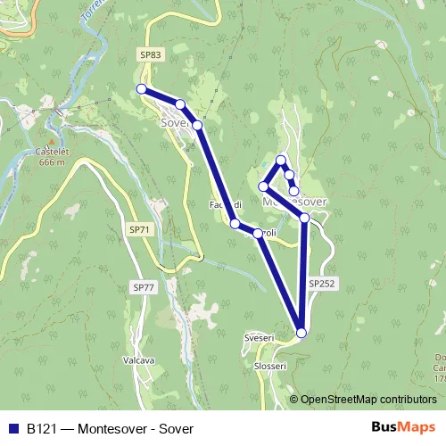 The first stop of the B121 bus route is Sover and the last stop is Montesover. B121 (Montesover - Sover) is operational during everyday.