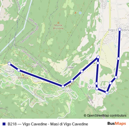 The first stop of the B218 bus route is Vigo Cavedine and the last stop is Drena. B218 (Vigo Cavedine - Masi di Vigo Cavedine) is operational during everyday.