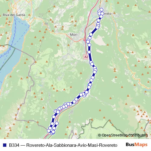 Via Manzoni - Strada Statale 12 del Brennero - Via Craffonara - Via Dante Alighieri - Via Benacense - Via Abetone - Corso Verona - Via Nazionale del Brennero - Via Pinera - Via 2 Novembre - Via Varini - Corso Antonio Cantore - Via Trento - Via Nazionale del Brennero - Autostrada del Brennero - Via Nazionale del Brennero - Corso Trento - Corso Passo Buole - Piazzale della Repubblica - Corso Passo Buole - Strada Provinciale Destra Adige - Via Pozza - Via Morielle - Viale Al Parco - Viale Alcide De Gasperi - Via Monte Baldo - Via del Lavoro - Strada Provinciale Destra Adige - Via alla Cà - Via Nazionale del Brennero