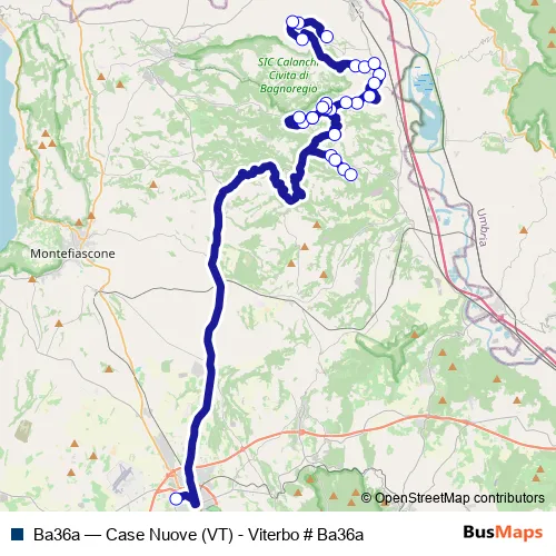 The first stop of the Ba36a bus route is Civitella | Case Nuove # f1357 and the last stop is Viterbo | Riello # f641. Ba36a (Case Nuove (VT) - Viterbo # Ba36a) is operational during everyday.