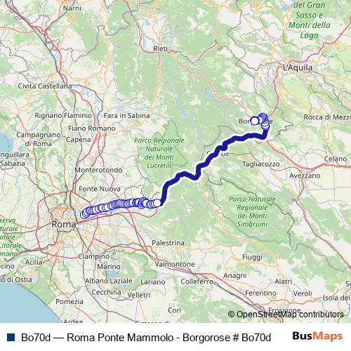 The first stop of the Bo70d bus route is Roma | Ponte Mammolo (Metro B) # f9014 and the last stop is Borgorose | Piazza Municipio # f8254. Bo70d (Roma Ponte Mammolo - Borgorose # Bo70d) is operational during everyday.