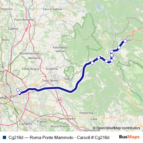 The first stop of the Cg216d bus route is Roma | Ponte Mammolo (Metro B) # f9014 and the last stop is Carsoli (AQ) | Stazione FS # f8688. Cg216d (Roma Ponte Mammolo - Carsoli # Cg216d) is operational during everyday.