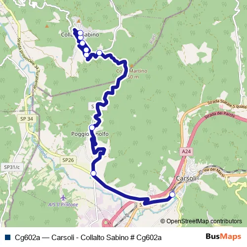 The first stop of the Cg602a bus route is Carsoli (AQ) | Stazione FS # f8688 and the last stop is Collalto | Piazza Marconi # f8844. Cg602a (Carsoli - Collalto Sabino # Cg602a) is operational during everyday.