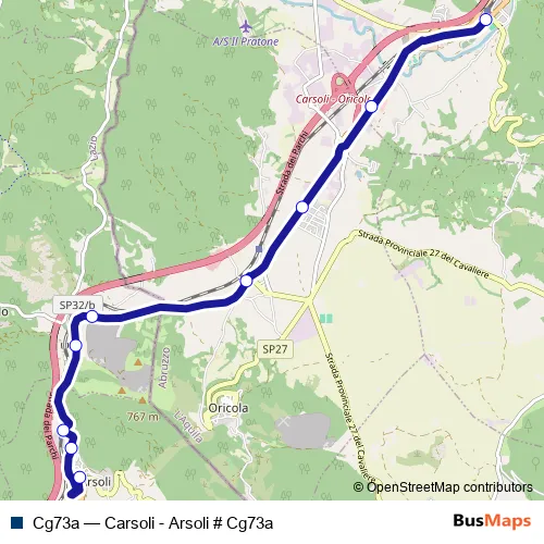 The first stop of the Cg73a bus route is Carsoli (AQ) | Stazione FS # f8688 and the last stop is Arsoli | Piazza Martiri # f8904. Cg73a (Carsoli - Arsoli # Cg73a) is operational during everyday.