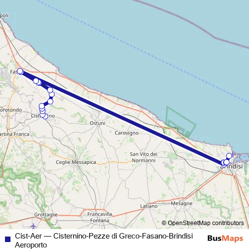 The first stop of the Cist-Aer bus route is Cisternino - piazza Navigatori and the last stop is Brindisi - Aeroporto del Salento. Cist-Aer (Cisternino-Pezze di Greco-Fasano-Brindisi Aeroporto) is operational during everyday.