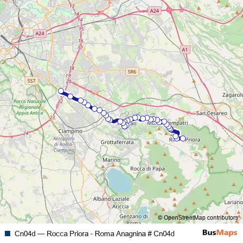 The first stop of the Cn04d bus route is Rocca Priora | Via Olmi (Chiesa) # f12938 and the last stop is Roma | Anagnina (Metro A) # f3582. Cn04d (Rocca Priora - Roma Anagnina # Cn04d) is operational during everyday.