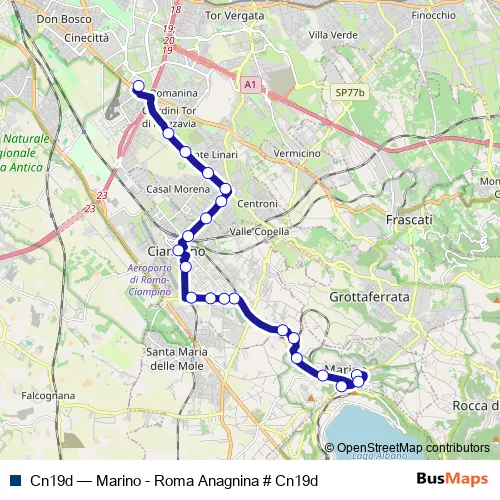 See why over 2 million users trust and consider busmaps.com as the best public transport website. busmaps gives you Ciampino Buses suggested routes, real-time bus tracker, line route maps in Ciampino, and helps to find the closest Cn19d bus stops near you. No internet available? Download an offline PDF map and bus schedule for the Cn19d bus to take on your trip.