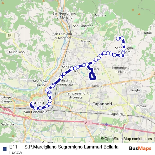 The first stop of the E11 bus route is Segromigno Cimitero and the last stop is Verdi 1. E11 (S.P.Marcigliano-Segromigno-Lammari-Bellaria-Lucca) is operational during everyday.