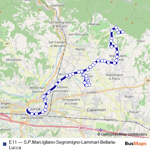 Services on the E11 - S.P.Marcigliano-Segromigno-Lammari-Bellaria-Lucca bus stop at 15:10 on Monday, Tuesday, Wednesday, Thursday, Friday, Saturday.