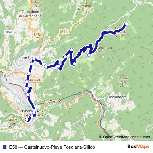 See why over 2 million users trust and consider busmaps.com as the best public transport website. busmaps gives you Pieve Fosciana Buses suggested routes, real-time bus tracker, line route maps in Pieve Fosciana, and helps to find the closest E58 bus stops near you. No internet available? Download an offline PDF map and bus schedule for the E58 bus to take on your trip.