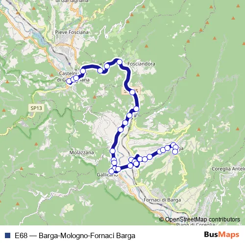 The first stop of the E68 bus route is Castelnuovo Garfagnana and the last stop is