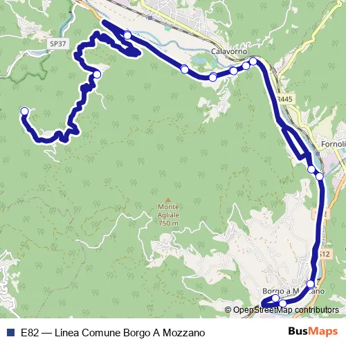 The first stop of the E82 bus route is Borgo A Mozzano Fs and the last stop is Borgo A Mozzano. E82 (Linea Comune Borgo A Mozzano) is operational during everyday.