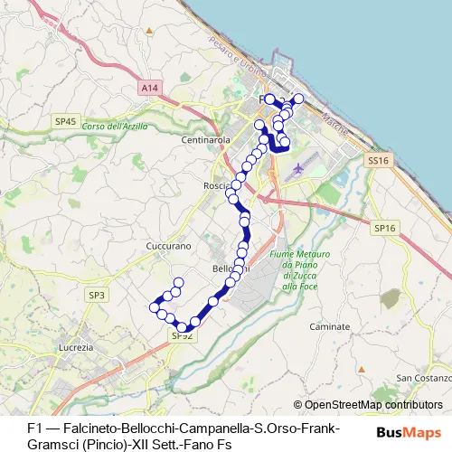 Click here to view the nearest F1 - Falcineto-Bellocchi-Campanella-S.Orso-Frank-Gramsci (Pincio)-XII Sett.-Fano Fs bus stop.