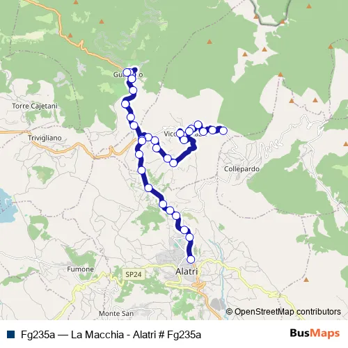 The first stop of the Fg235a bus route is Vico | Fontana La Macchia # f6127 and the last stop is Alatri | Via Circonvallazione Via Fiuggi # f4700. Fg235a (La Macchia - Alatri # Fg235a) is operational during everyday.