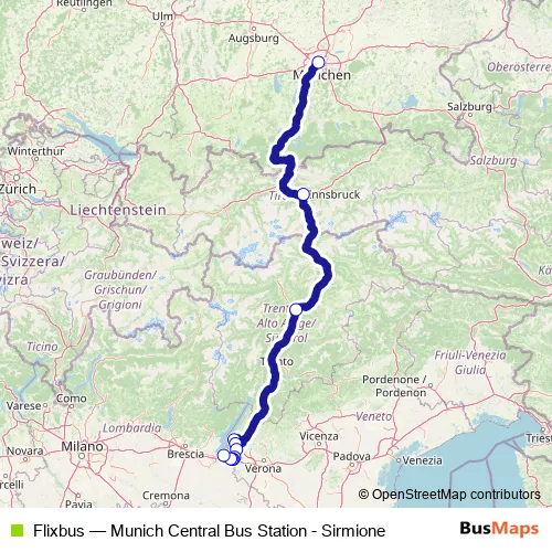 The first stop of the Flixbus bus route is Munich Central Bus Station and the last stop is Sirmione Colombare. Flixbus (Munich Central Bus Station - Sirmione) is operational during everyday.