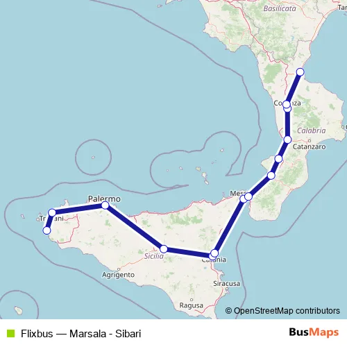 The first stop of the Flixbus bus route is Marsala Train Station Bus Stop and the last stop is Sibari Via della Ferrovia. Flixbus (Marsala - Sibari) is operational during everyday.