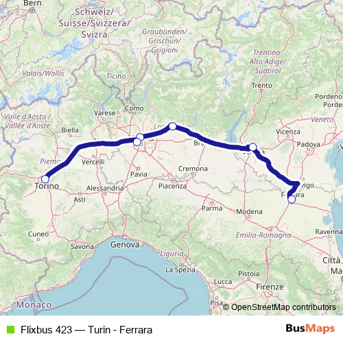 The first stop of the Flixbus 423 bus route is Ferrara and the last stop is Turin (Vittorio Emanuele). Flixbus 423 (Turin - Ferrara) is operational during everyday.