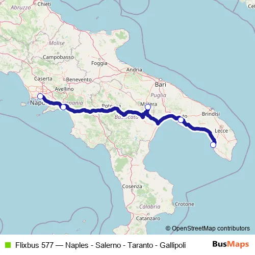 Click here to view the nearest Flixbus 577 - Naples - Salerno - Taranto - Gallipoli bus stop.