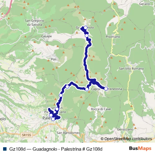The first stop of the Gz108d bus route is Capranica P. | Guadagnolo # f14553 and the last stop is Palestrina | Porta del Sole # f12264. Gz108d (Guadagnolo - Palestrina # Gz108d) is operational during everyday.