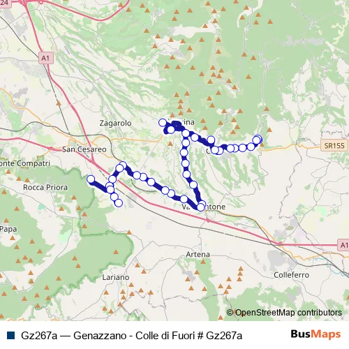 The first stop of the Gz267a bus route is Genazzano DEP # Gzdep and the last stop is Rocca Priora | Colle di Fuori # f12911. Gz267a (Genazzano - Colle di Fuori # Gz267a) is operational during on weekdays.