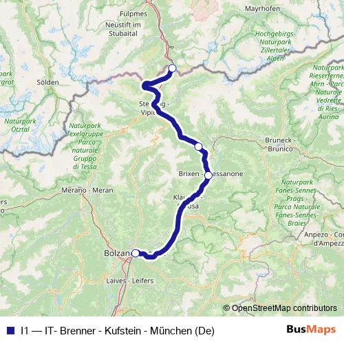 The first stop of the I1 rail route is Brennero, Stazione di Brennero and the last stop is Bolzano, Stazione di Bolzano. I1 (IT- Brenner - Kufstein - München (De)) is operational during everyday.