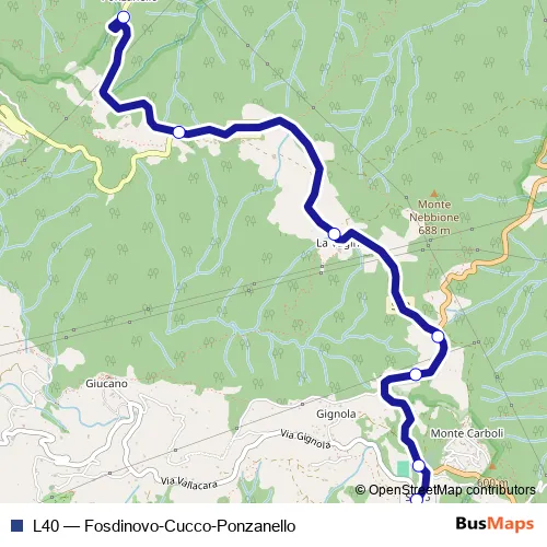 The first stop of the L40 bus route is Ponzanello and the last stop is Fosdinovo. L40 (Fosdinovo-Cucco-Ponzanello) is operational during everyday.