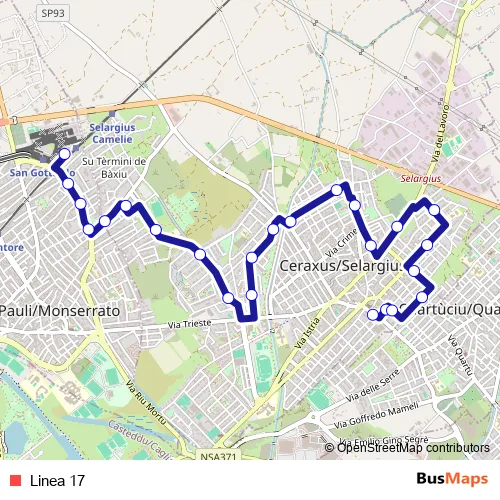See why over 2 million users trust and consider busmaps.com as the best public transport website. busmaps gives you Selargius Buses suggested routes, real-time bus tracker, line route maps in Selargius, and helps to find the closest Linea 17 bus stops near you. No internet available? Download an offline PDF map and bus schedule for the Linea 17 bus to take on your trip.