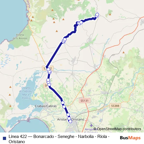 The first stop of the Linea 422 bus route is Oristano Stazione Arst and the last stop is Bonarcado Corso Italia 18. Linea 422 (Bonarcado - Seneghe - Narbolia - Riola - Oristano) is operational during everyday.