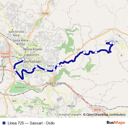 The first stop of the Linea 725 bus route is Osilo Rosario and the last stop is Sassari VIA Padre Zirano. Linea 725 (Sassari - Osilo) is operational during everyday.