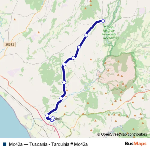 The first stop of the Mc42a bus route is Tuscania Rio Frecciaro # f7896 and the last stop is Tarquinia Barriera S.Giusto # f7521. Mc42a (Tuscania - Tarquinia # Mc42a) is operational during everyday.