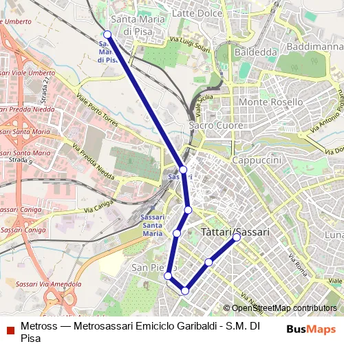 The first stop of the Metross tram route is Santa Maria DI Pisa and the last stop is Emiciclo Garibaldi. Metross (Metrosassari Emiciclo Garibaldi - S.M. DI Pisa) is operational during everyday.