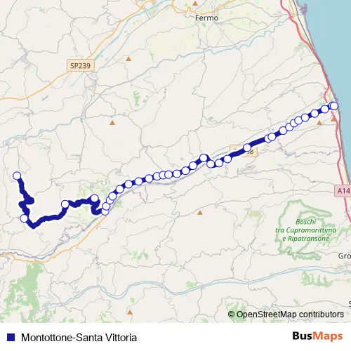 The first stop of the Montottone-Santa Vittoria bus route is Monteleone Di Fermo and the last stop is
