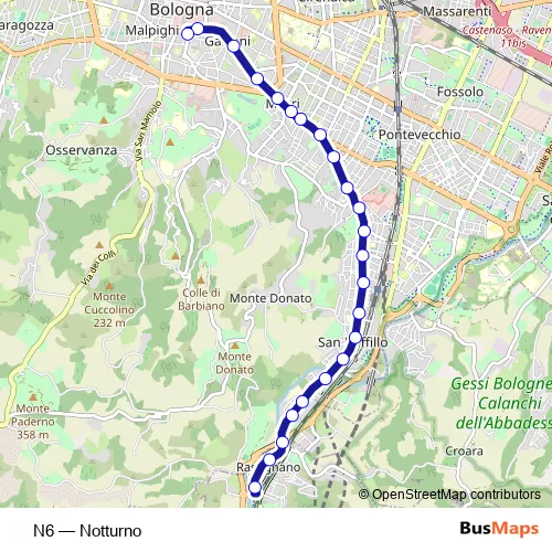 The first stop of the N6 bus route is Rastignano and the last stop is Piazza Cavour. N6 (Notturno) is operational during on weekends.