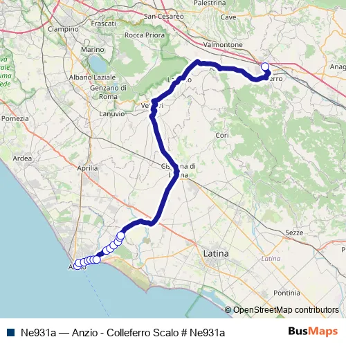 The first stop of the Ne931a bus route is Anzio | Piazza C.Battisti # f2911 and the last stop is Colleferro | Via Casilina Via Romana # f4929. Ne931a (Anzio - Colleferro Scalo # Ne931a) is operational during everyday.