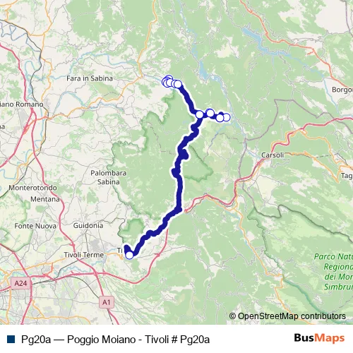 The first stop of the Pg20a bus route is Poggio Moiano | Deposito # f9727 and the last stop is Tivoli | Largo Saragat # f00005. Pg20a (Poggio Moiano - Tivoli # Pg20a) is operational during everyday.