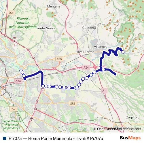 The first stop of the Pi707a bus route is Roma | Ponte Mammolo (Metro B) # f9014 and the last stop is Tivoli | Largo Saragat # f00005. Pi707a (Roma Ponte Mammolo - Tivoli # Pi707a) is operational during everyday.