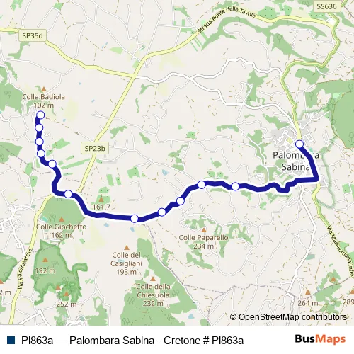 The first stop of the Pl863a bus route is Palombara | Viale Rieti # f14836 and the last stop is Palombara | Cretone # f14012. Pl863a (Palombara Sabina - Cretone # Pl863a) is operational during everyday.