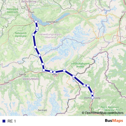 Piazza Giacomo Matteotti - Via alla stazione - Viale Stazione - Viktoriastrasse - Bahnhofstrasse - Ladustrasse - Bahnhofstrasse - Innere Meriweg - Untere Bahnhofstrasse - Hauptstrasse - Stationsstrasse - Bahnhofstrasse