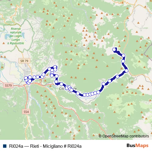 The first stop of the Ri024a bus route is Rieti | Stazione FS Ist. Superiore Principessa di Napoli # f1070 and the last stop is