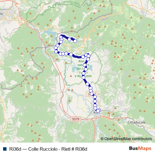 The first stop of the Ri36d bus route is Labro | Colle Rucciolo # f9107 and the last stop is Rieti | Stazione FS Ist. Superiore Principessa di Napoli # f1070. Ri36d (Colle Rucciolo - Rieti # Ri36d) is operational during everyday.