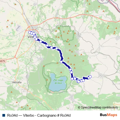The first stop of the Ro34d bus route is Viterbo | Riello # f641 and the last stop is Carbognano | Via Fabrica Via S. Anna # f2571. Ro34d (Viterbo - Carbognano # Ro34d) is operational during everyday.