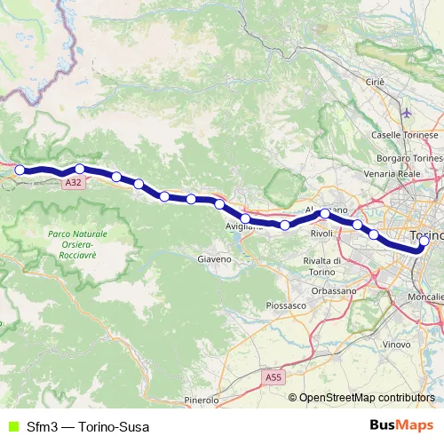 The first stop of the Sfm3 rail route is Torino Porta Nuova and the last stop is Susa. Sfm3 (Torino-Susa) is operational during everyday.