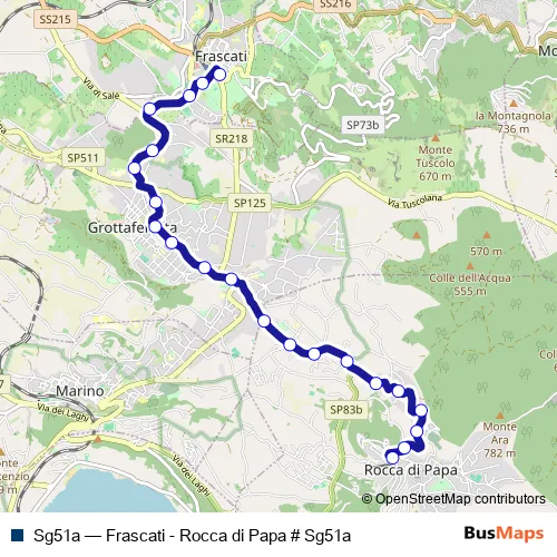 The first stop of the Sg51a bus route is Frascati | Piazza Marconi # f12858 and the last stop is Rocca DI Papa | Piazza della Repubblica # f13175. Sg51a (Frascati - Rocca di Papa # Sg51a) is operational during on weekdays.
