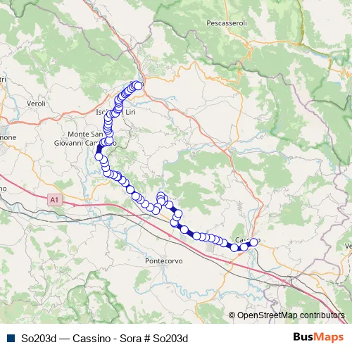 The first stop of the So203d bus route is Cassino Sud via De Nicola # f4440 and the last stop is Sora | Stazione FS # f5890. So203d (Cassino - Sora # So203d) is operational during everyday.