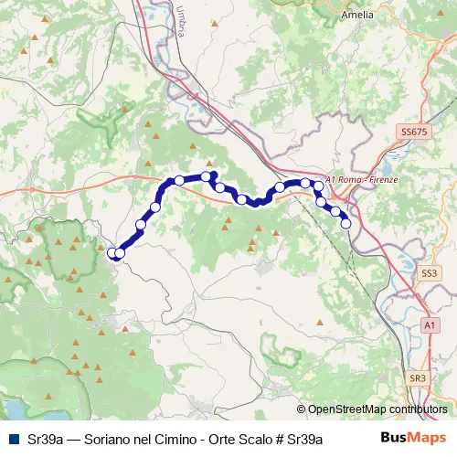 The first stop of the Sr39a bus route is Soriano | Stazione # f1744 and the last stop is Orte | Stazione FS # f1703. Sr39a (Soriano nel Cimino - Orte Scalo # Sr39a) is operational during everyday.