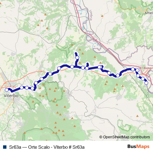 The first stop of the Sr63a bus route is Orte | Stazione FS # f1703 and the last stop is Viterbo | Riello # f641. Sr63a (Orte Scalo - Viterbo # Sr63a) is operational during everyday.