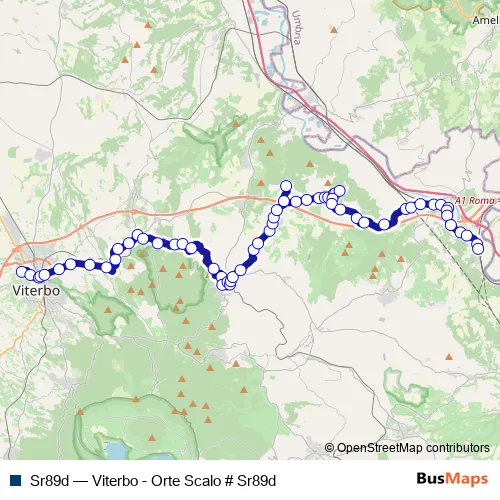 The first stop of the Sr89d bus route is Viterbo | Riello # f641 and the last stop is Orte | Stazione FS # f1703. Sr89d (Viterbo - Orte Scalo # Sr89d) is operational during everyday.