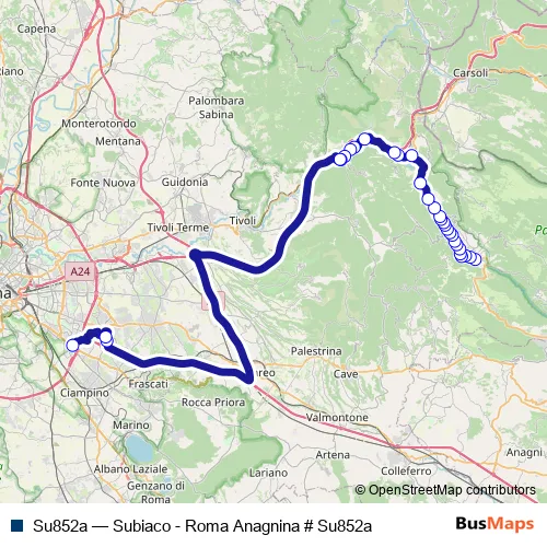 The first stop of the Su852a bus route is Subiaco | Piazza Falcone # f4782 and the last stop is Roma | Anagnina (Metro A) # f3583. Su852a (Subiaco - Roma Anagnina # Su852a) is operational during on weekdays.