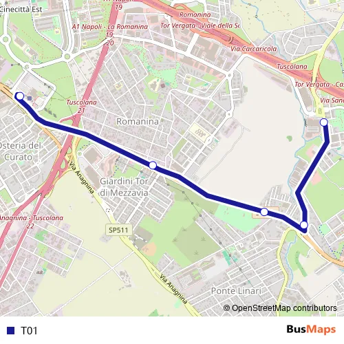 The first stop of the T01 bus route is TOR Vergata/Schiavonetti and the last stop is Anagnina (Ma). T01 is operational during everyday.