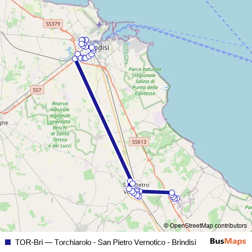 The first stop of the TOR-Bri bus route is Torchiarolo - Via C. Colombo - Capolinea-Villetta Padre Pio and the last stop is Brindisi - Via Provinciale San Vito (Conad) dir. San Vito. TOR-Bri (Torchiarolo - San Pietro Vernotico - Brindisi) is operational during everyday.